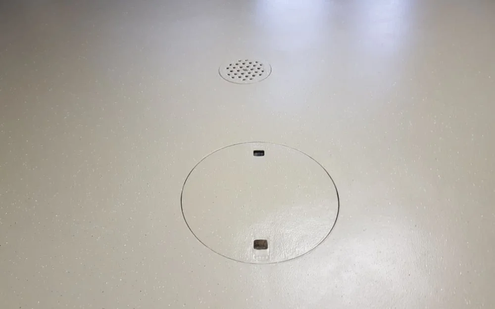 Wasserablauf und Schachtdeckel in der fertigen Bodenbeschichtung