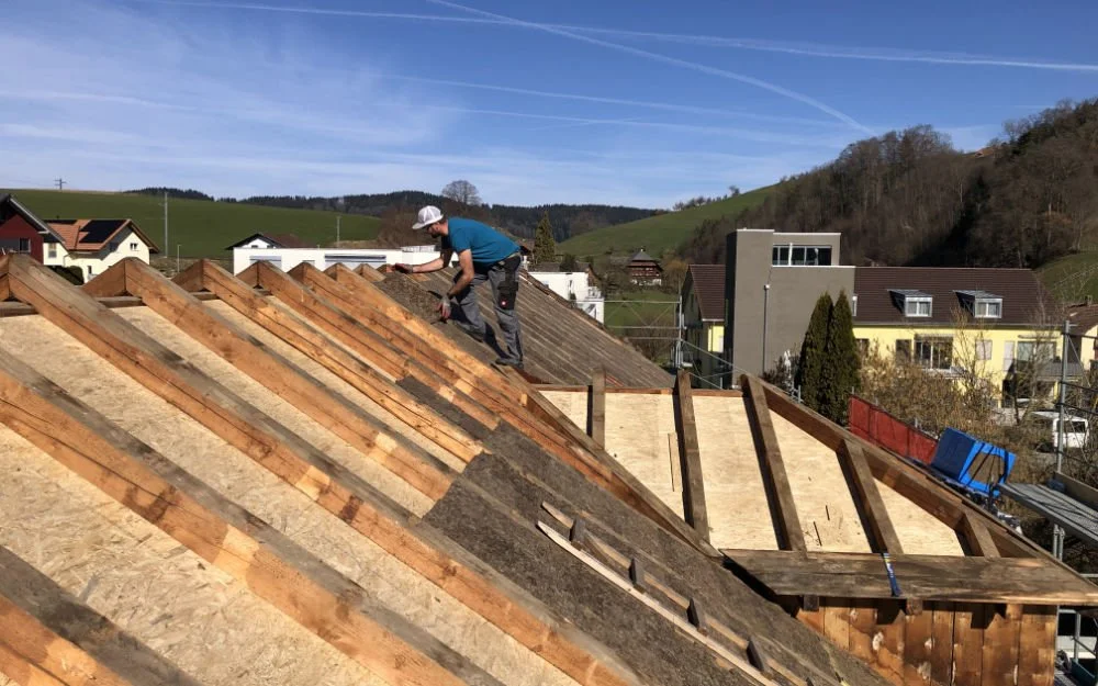 Die Arbeiten begannen mit der Installation eines Baugerüstes, um einen reibungslosen und sicheren Ablauf zu gewährleisten. Anschliessend erfolgte der fachgerechte Abbruch und die Entsorgung der bestehenden Ziegel. Dieser Schritt ist entscheidend, um eine saubere Basis für den neuen Dachaufbau zu schaffen.