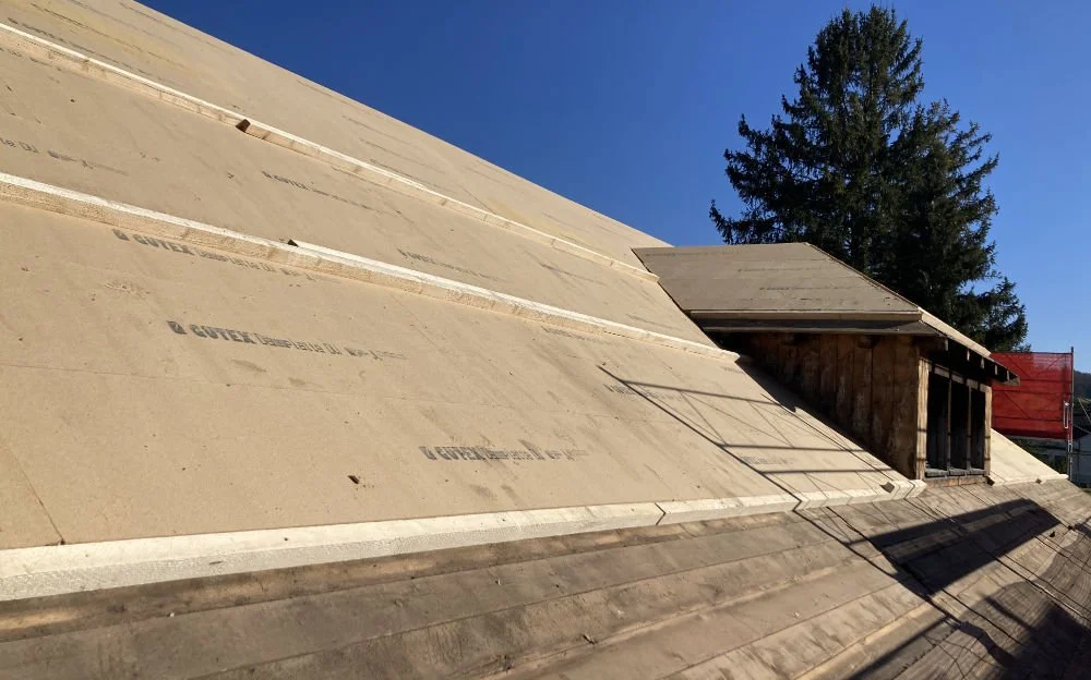 Nach dem Abbruch wurde der Dachaufbau von Grund auf erneuert. Die neu angebrachte Wärmedämmung reduziert Energieverluste deutlich und sorgt in den Werk- und Atelierräumen für ein angenehmes Raumklima - im Winter warm, im Sommer kühl. Das Unterdach (Holzfaserplatte) und die präzise ausgeführte Unterkonstruktion bilden die Basis für die neue Ziegeleindeckung und die Photovoltaik-Module.